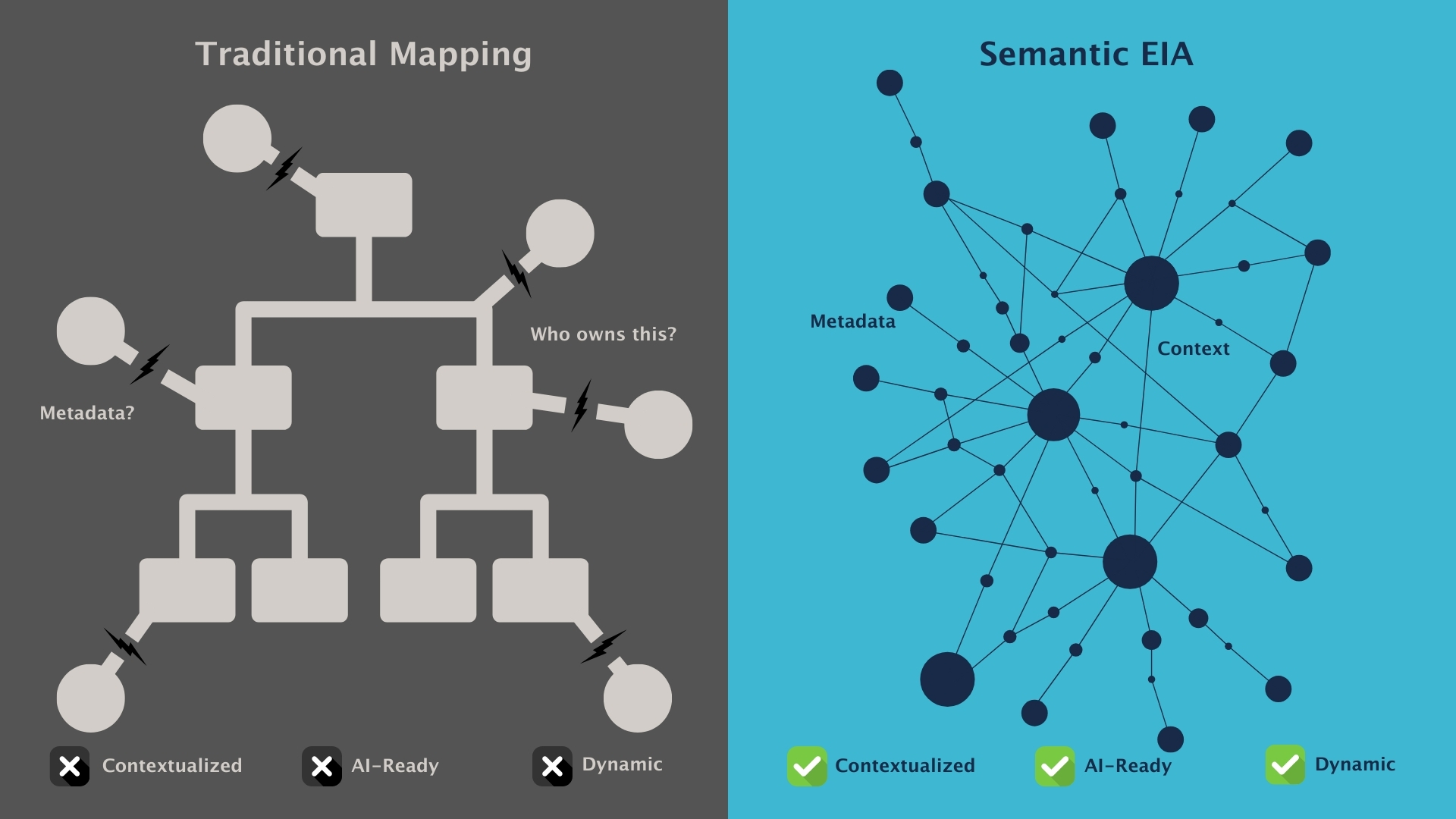 A semantics-based EIA transforms traditional mapping by integrating existing assets through a semantic model, unifying relevant metadata in context. This goes far beyond what Wikis or existing systems can achieve, providing a dynamic, interconnected map of the organization.