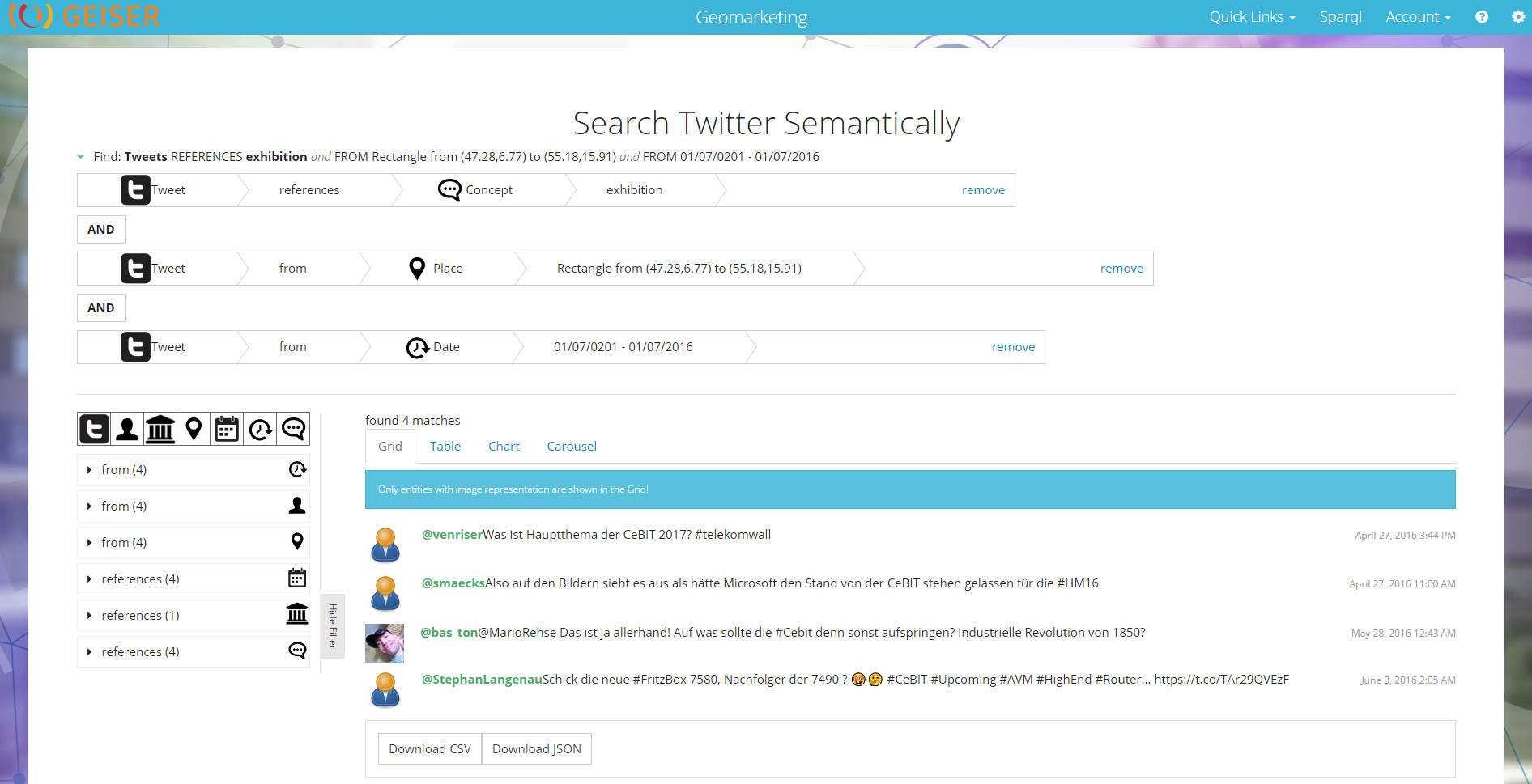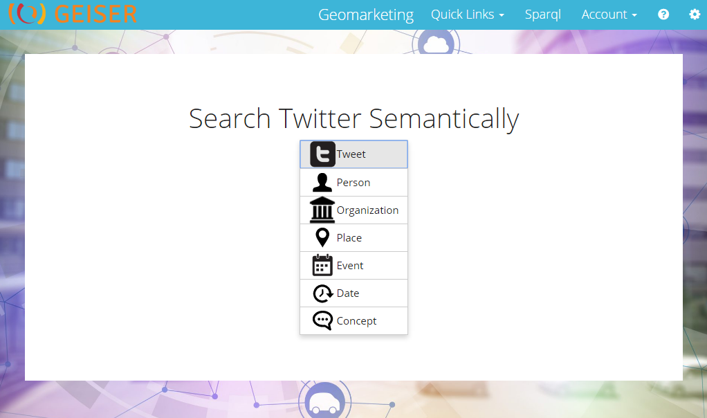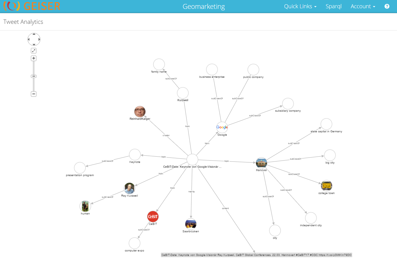 Powered by metaphactory, GEISER, a project funded by the German Federal Ministry of Economic Affairs and Energy, uses geospatial data as raw material for intelligent, location-based services and delivers great promise for also supporting small and medium-sized businesses and retailers in linking sensor data with Social Media data, Open Data, forums, websites and internal customer data, so as to improve their advertising and marketing strategies.