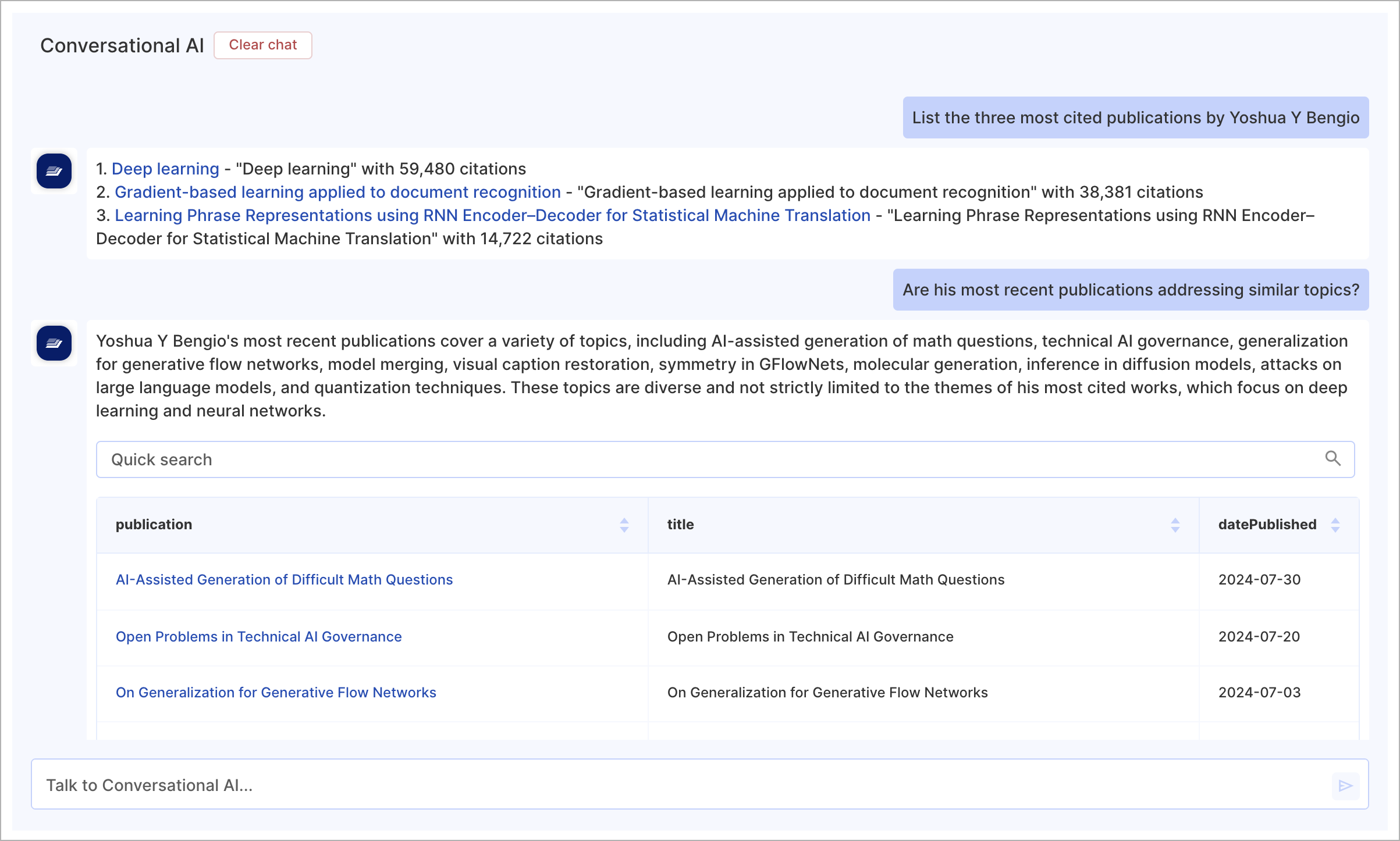 - Conversational Interface utilizing LLMs - Beta version, allowing end users to lead contextualised conversations with the graph. The conversational interface is enabled by a range of tools and services that allow answering queries of different kinds over the knowledge graph, including the generation, refinement and execution of structured queries as well as answering unstructured queries using a RAG-approach (Retrieval Augmented Generation). Depending on the user question, the conversational interface selects and orchestrates the adequate services to answer the question and render the results in natural language or structured format for further processing.
