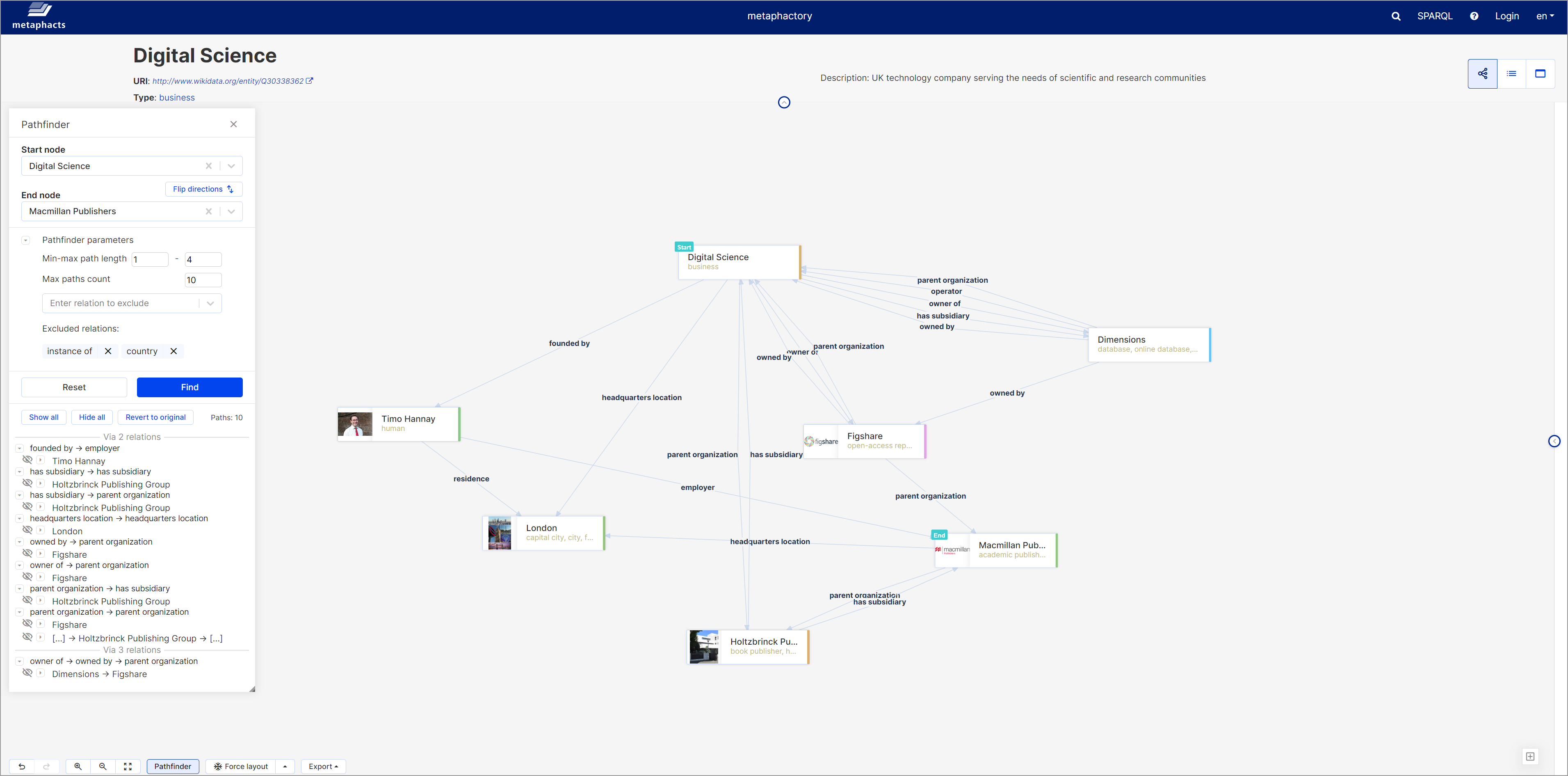 Image 4: Using the pathfinding interface to identify relations between Digital Science (start node) and Macmillan Publishers (end node).