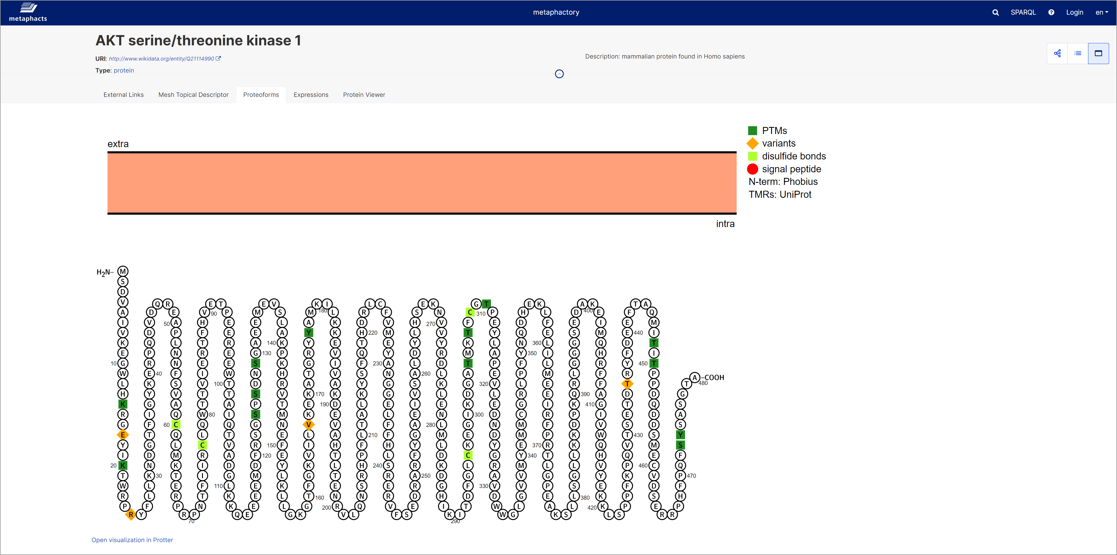 Image 2: AKT serine/threonine kinase 1 protein displayed through the Proteoforms interface using federation over additional data sources